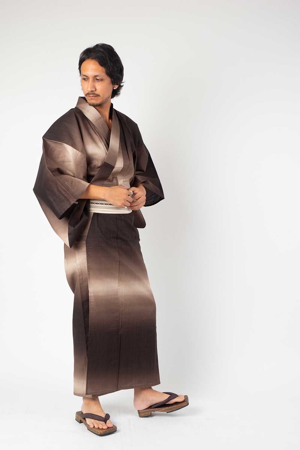 |送料無料|浴衣 メンズ浴衣4点セット 日本製高級生地【浴衣+帯+下駄+腰紐】一秀グラデーションBROWN・ 男性用お仕立て上がり浴衣4点セット メンズ 男浴衣 ゆかた ブラウン 茶色 無地ぼかし 小物 M L LL 大きいサイズ ブラウン 夏 夏物 おしゃれ 腰ひも レトロ 粋 大人